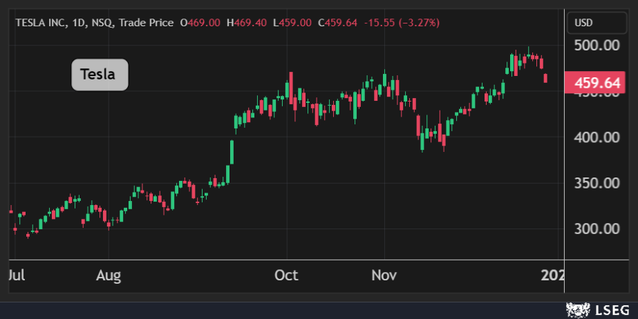 انخفضت أسهم شركة Tesla بنسبة 3.3% في جلسة الإثنين مسجلأً رابع خسارة يومية على التوالي، لتفقد الشركة 52 مليار دولار من قيمتها السوقية في يوم واحد.