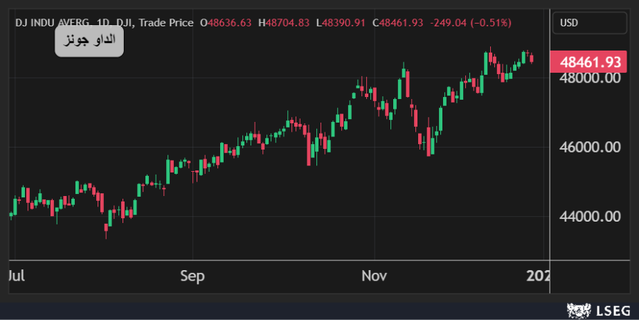 تراجع مؤشر الداو جونز بنسبة 0.5% أي ما يعادل 249 نقطة في جلسة الإثنين مسجلاً ثاني خسارة يومية على التوالي.