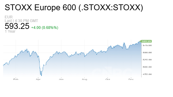 وصعد المؤشر ستوكس 600 الأوروبي 0.6% ليسجل 592.78 نقطة ويقترب من حاجز 600 نقطة.