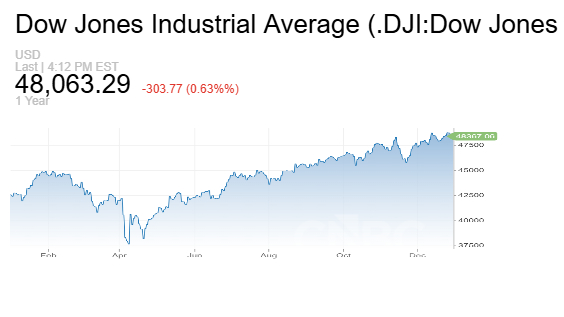 أما مؤشر ناسداك فقد ارتفع بنسبة 20.36% مدفوعاً بحماس المستثمرين تجاه الذكاء الاصطناعي، فيما صعد مؤشر داو جونز بنسبة 12.97% خلال 2025، متأثراً نسبياً بضعف تمثيله لقطاع التكنولوجيا.