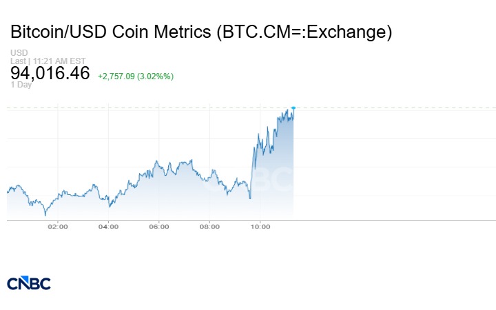 وتجاوزت البتكوين تتجاوز 94 ألف دولار، خلال تعاملات الاثنين 5 يناير/ كانون الثاني، بعد أن ارتفعت العملة المشفرة الأكبر من حيث القيمة السوقية بأكثر من 3% في أحدث التعاملات.