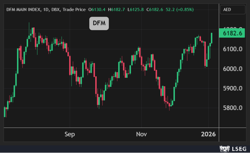 وفي سوق دبي، ارتفع المؤشر العام بنسبة 0.85% في جلسة الثلاثاء مسجلاً رابع مكاسب يومية على التوالي ليغلق عند أعلى مستوياته في 5 أشهر بدعم من ارتفاع سهم إعمار العقارية بأكثر من 2%.