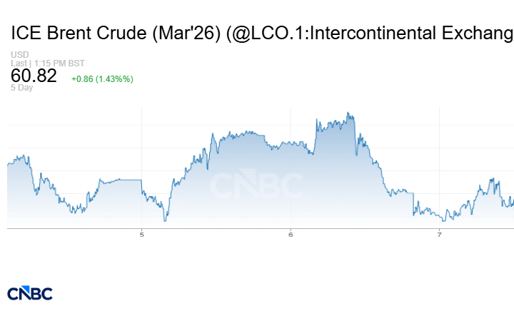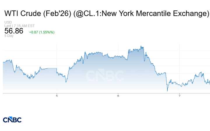 منذ بداية الأسبوع الجاري -وهو الأسبوع الأول للتداولات بعد أحداث فنزويلا والقبض على مادورو وتقديم للمحاكمة في الولايات المتحدة- سجلت العقود الآجلة للخام الأميركي انخفاضاً بأكثر من 2% -حتى تسوية تعاملات الخميس 8 يناير/ كانون الثاني- وفق حسابات CNBC عربية. كما تراجعت العقود الآجلة لخام برنت بنحو 1.3%.