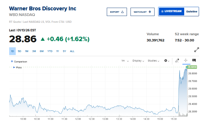 وسجلت أسهم وارنر براذرز ديسكفري ارتفاعاً بنسبة 1.6% يوم الثلاثاء بعد تقارير أشارت إلى إمكانية تعديل شروط الصفقة، ما يوحي بأن الخطوة تحظى بتأييد المستثمرين.