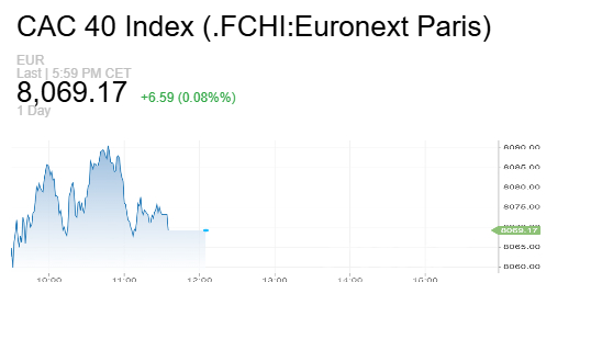 ارتفع مؤشر CAC 40 الفرنسي بنسبة 0.08% ليغلق عند 8,069 نقطة