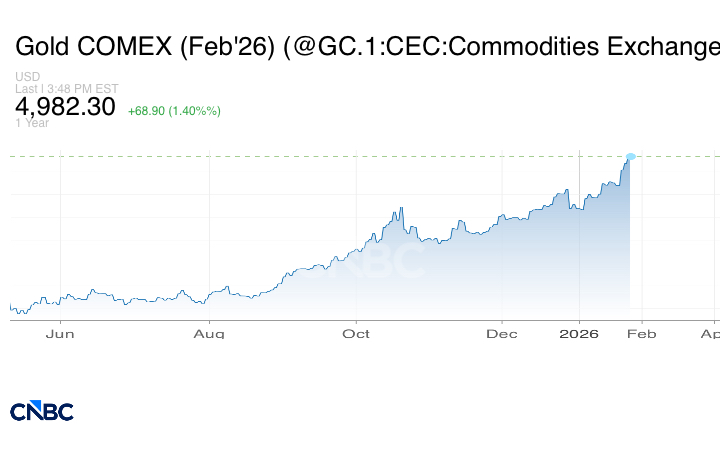 زادت العقود الآجلة للمعدن الأصفر تسليم فبراير بنسبة 1.35% أو ما يعادل 66.3 دولار إلى 4979.70 دولار للأونصة، لتسجل الإغلاق القياسي السادس في 2026، وتحقق مكاسب أسبوعية بنسبة 8.4% هي الأعلى منذ بداية أزمة الوباء في عام 2020.