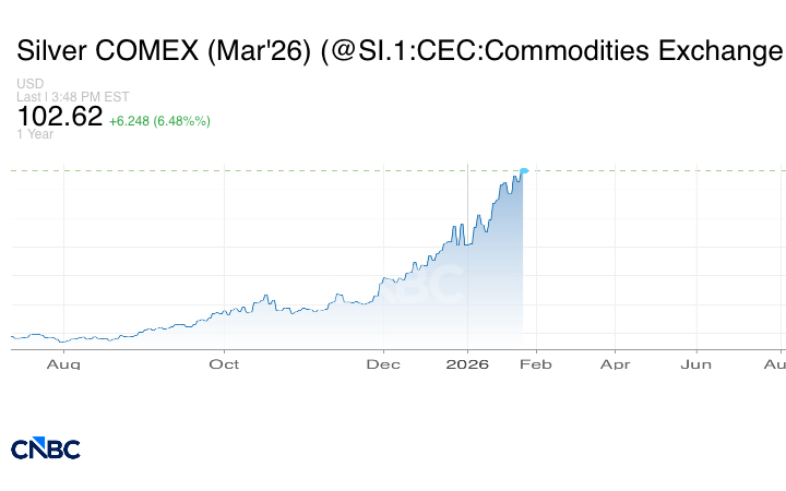 ويأتي ارتفاع الفضة لمستوى 100 دولار للأونصة مع إقبال المستثمرين على أصول الملاذ الآمن على خلفية الاضطرابات الجيوسياسية، ووسط توقعات بخفض مجلس الاحتياطي الفدرالي الأميركي أسعار الفائدة.