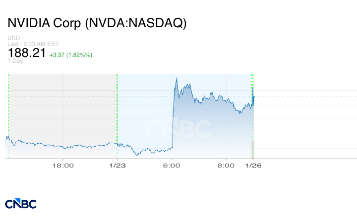ارتفعت أسهم شركتي إنفيديا وأدفانسد مايكرو ديفايسز بأكثر من 1% ونحو 3% على التوالي في بداية التداولات. وتأتي هذه التحركات بعد أن أفادت مصادر مطلعة لشبكة CNBC أن الرئيس التنفيذي لشركة إنفيديا، جنسن هوانغ، يعتزم زيارة الصين خلال الأيام القادمة.