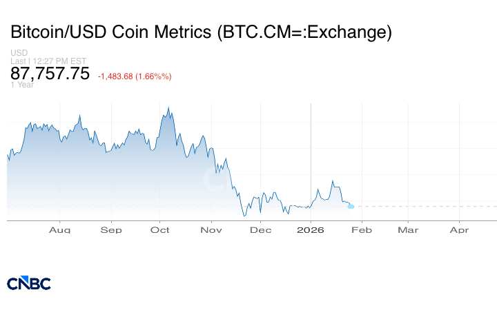 وكان سعر أكبر عملة مشفرة قد تجاوز في وقت سابق من هذا الأسبوع حاجز 90 ألف دولار، لكنها عادت للتراجع، بعد أن صرّح الرئيس دونالد ترامب، خلال كلمته في المنتدى الاقتصادي العالمي في دافوس، بأن الولايات المتحدة لا تنوي الاستيلاء على غرينلاند بالقوة. كما أعرب الرئيس عن تفاؤله بشأن إقرار مشروع قانون هيكلة سوق العملات المشفرة.