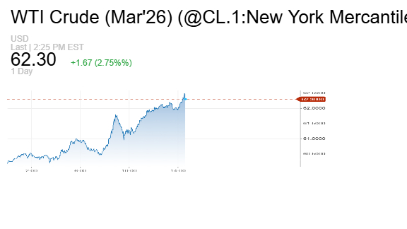 ارتفعت العقود الآجلة للخام الأميركي 1.76 دولار بما يعادل 2.90% إلى 62.39 دولاراً للبرميل.