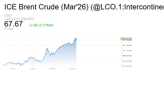 وارتفعت العقود الآجلة لخام برنت 1.98 دولار أو 3.02% إلى 67.57 دولاراً للبرميل عند التسوية.