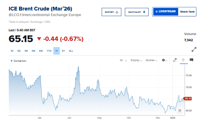 وتراجعت العقود الآجلة لخام برنت 0.6%، لتسجّل 65.15 دولاراً للبرميل.