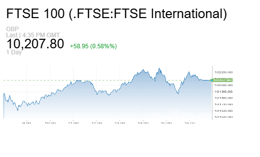 كما ارتفع مؤشر "فوتسي 100" البريطاني بنسبة 0.58% إلى 10,207.80 نقطة