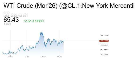 كما ارتفعت العقود الآجلة لخام غرب تكساس الوسيط الأميركي 2.21 دولار أو 3.5% إلى 65.42 دولاراً للبرميل.