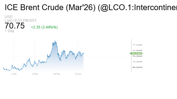 وصعدت العقود الآجلة لخام برنت 2.31 دولار أو 3.38% إلى 70.71 دولاراً للبرميل عند التسوية.