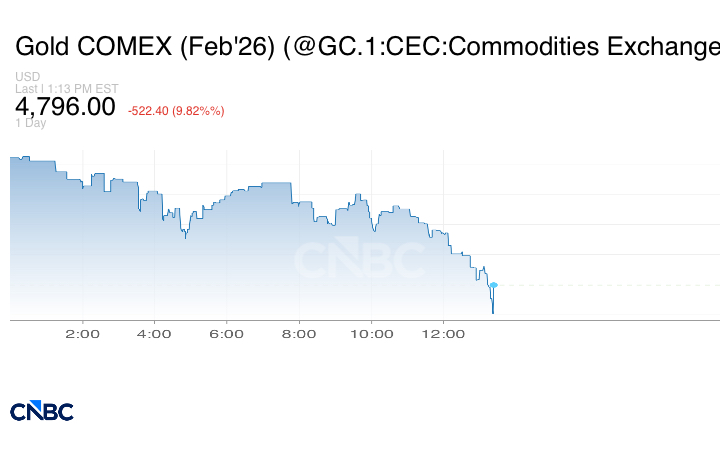 انخفض سعر الذهب الفوري بنحو 9% ليسجل 4895.22 دولاراً للأونصة. وتراجعت العقود الآجلة للذهب بنسبة 11.4% عند التسوية عند 4745.10 دولاراً.