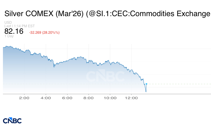 وتكبد سعر الفضة خسائر فادحة في المعاملات الفورية بعد انخفاضه 30% عند 80.55 دولاراً للأونصة، ويتداول عند أدنى مستوياته في اليوم.