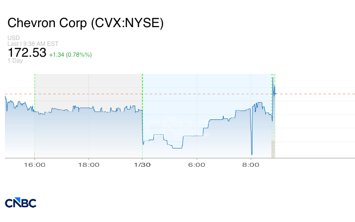 تجاوزت شركة النفط الأميركية Chevron أرباح الربع الرابع توقعات المحللين بفضل الإنتاج النفطي القياسي. وبلغت الأرباح المعدلة للشركة 1.52 دولار للسهم، متجاوزةً بذلك متوسط ​​توقعات مجموعة بورصة لندن البالغ 1.45 دولار للسهم.