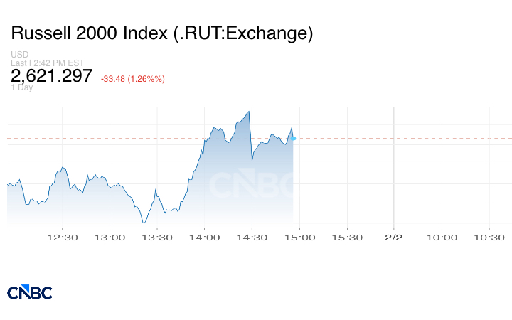 تراجع المؤشر، الذي يركز على الشركات الصغيرة، بنسبة تقارب 1.5% في منتصف جلسة التداول. وبالمقارنة، انخفض مؤشر ستاندرد آند بورز 500 بنسبة أقل من 0.5%.