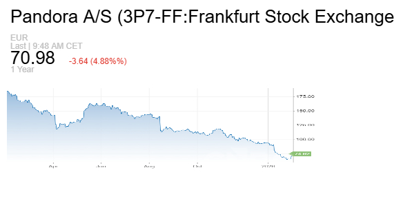 تراجعت أسهم شركة باندورا، أكبر شركة مجوهرات في العالم، بنسبة تقارب 7% بعد أن حذر محللو "جيفريز" من أن الشركة تواجه ضغوطاً بسبب ارتفاع أسعار الفضة وتراجع ثقة المستهلكين.