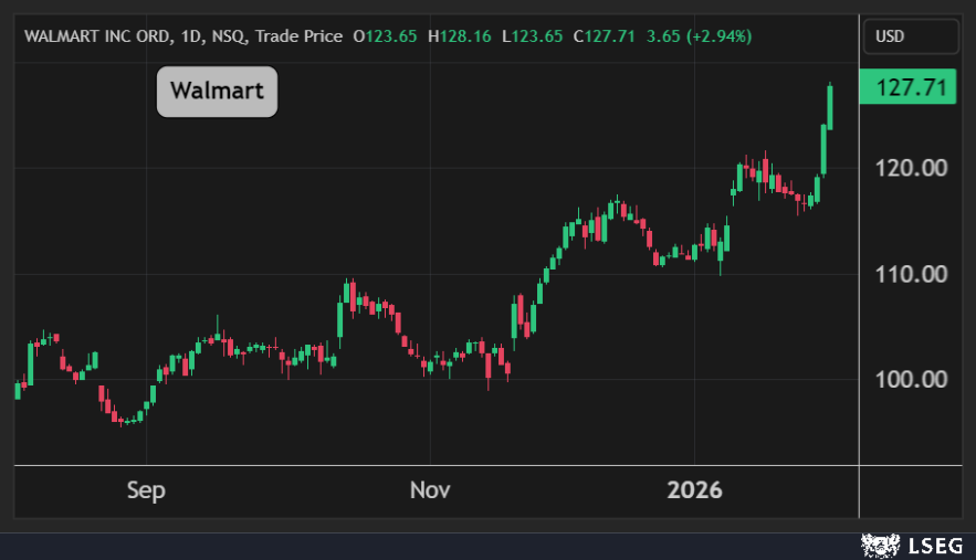 ارتفع سهم Walmart بنحو 3% في جلسة الثلاثاء ليغلق فوق مستويات 127 دولاراً لأول مرة في تاريخه، لتضيف الشركة 29 مليار دولار إلى قيمتها السوقية في يوم واحد.