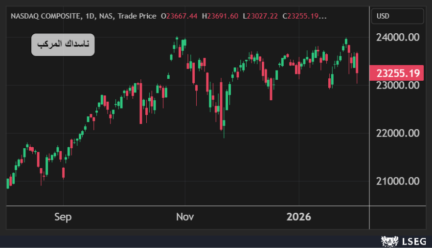 كما تراجع مؤشر S&P500 بنسبة 0.8% مسجلاً أكبر خسارة يومية في أسبوعين، وانخفض مؤشر ناسداك المركب بنسبة 1.4% مسجلاً أدنى إغلاق يومي في أسبوعين.