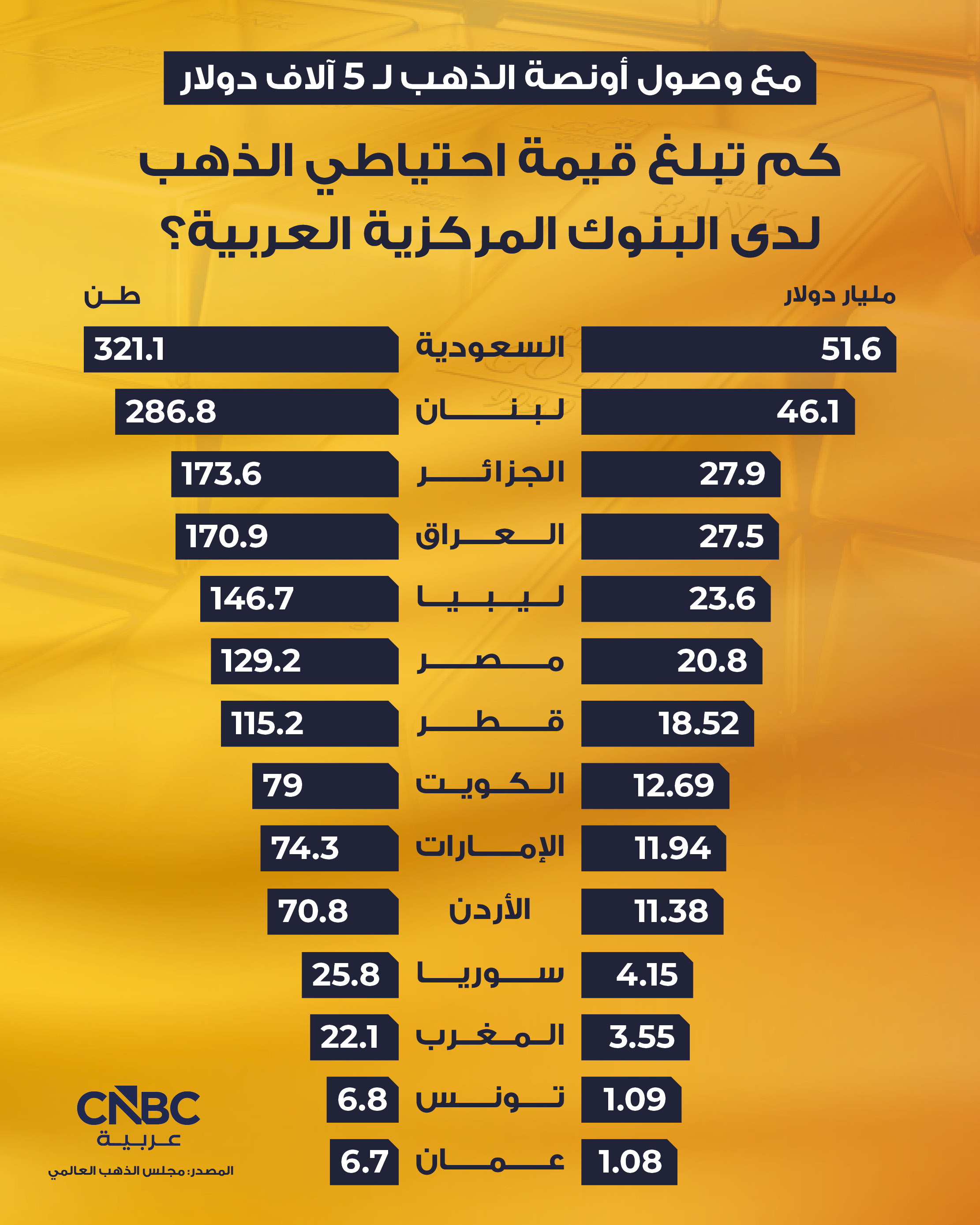 وتضم القائمة أيضاً الأردن باحتياطي يبلغ 70.8 طناً بقيمة 11.38 مليار دولار، وسوريا بـ25.8 طناً تُقدَّر بنحو 4.15 مليار دولار، والمغرب بـ22.1 طناً بقيمة 3.55 مليار دولار.