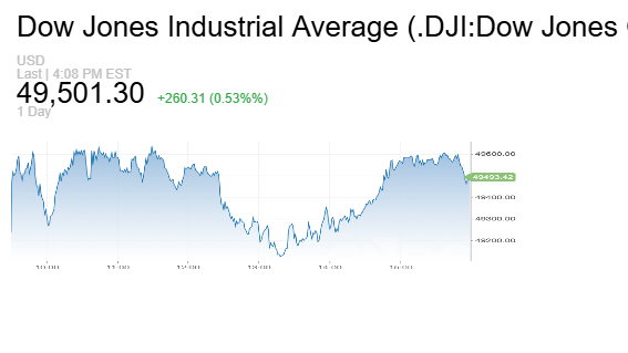 بينما أضاف مؤشر داو جونز الصناعي 259.91 نقطة أي ما يعادل 0.5%