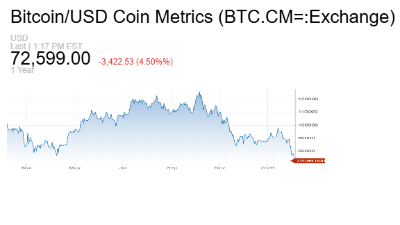 فقد هبطت البيتكوين على منصة Bitfinex إلى 72,713 دولار بخسارة 5.15% عن الإغلاق السابق، بينما سجلت على منصة Coin Metrics 72,412 دولار بانخفاض 4.75%.