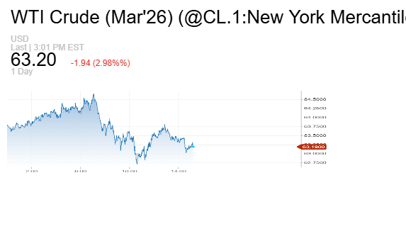 كما هوت العقود الآجلة للخام الأميركي1.85 دولار أو 2.84% إلى 63.29 دولار للبرميل.