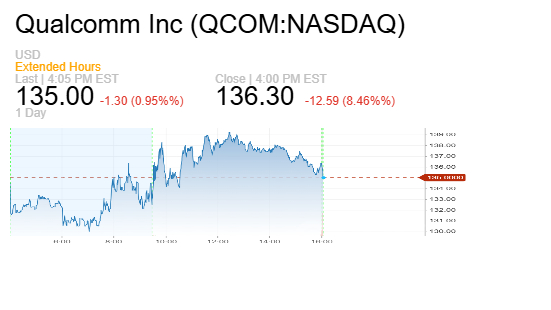 هبط سهم شركة كوالكوم بنسبة 9.5% بعدما أثرت أزمة عالمية في قطاع الذاكرة على توقعاتها المستقبلية. وتتوقع الشركة أرباحاً معدلة للربع الثاني المالي تتراوح بين 2.45 و2.65 دولار للسهم، مع إيرادات بين 10.2 و11 مليار دولار. في المقابل، كان محللو LSEG يتوقعون مبيعات بقيمة 11.11 مليار دولار وأرباحاً عند 2.89 دولار للسهم.