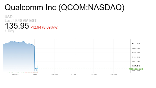 في المقابل، تعرضت كوالكوم لضغوط قوية، حيث هبطت أسهمها 9% بعد توقعات أضعف من المتوقع بسبب نقص عالمي في الذاكرة.