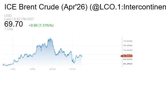 ارتفعت العقود الآجلة لخام برنت تصعد عند التسوية 60 سنتا أو 0.87% إلى 69.40دولار للبرميل.