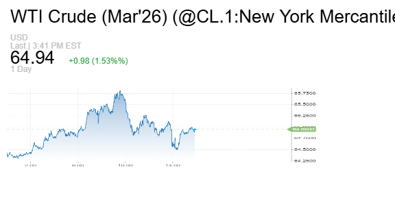 كما صعدت العقود الآجلة للخام الأميركي عند التسوية 67 سنتا أو 1.05% إلى 64.63 دولار للبرميل.