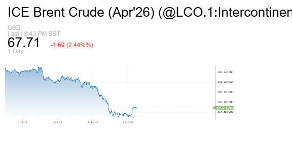 وعلى صعيد التداولات، انخفضت العقود الآجلة لخام برنت 1.88 دولار أو 2.71% لتبلغ عند التسوية 67.52 دولار للبرميل.