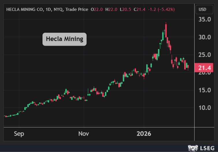 سجلت أسهم شركات تعدين الفضة خسائر حادة في جلسة الثلاثاء بعد أن تراجعت أسعار الفضة الفورية بنسبة 4% إلى مستويات 73 دولاراً للأونصة مسجلة ثاني خسارة يومية على التوالي في ظل انحسار جزئي للمخاطر الجيوسياسية، بالإضافة لارتفاع مؤشر الدولار الأميركي.