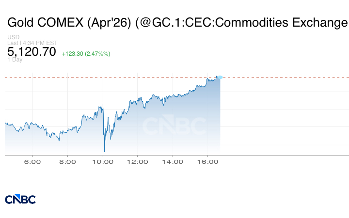 واستقرت العقود الآجلة للذهب الأميركي تسليم أبريل على ارتفاع بنسبة 1.7% عند 5080.90 دولاراً.