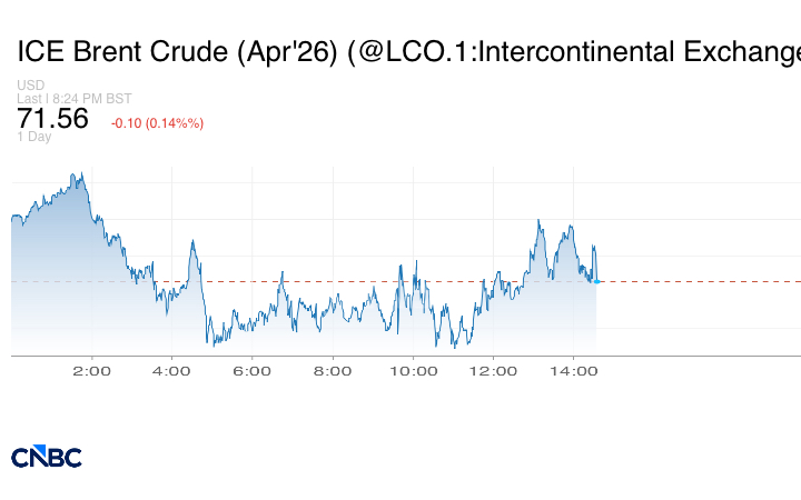 وانخفضت العقود الآجلة لخام برنت القياسي العالمي، تسليم أبريل، بمقدار 14 سنتاً لتصل إلى 71.56 دولاراً للبرميل، متراجعةً عن مكاسبها السابقة.
