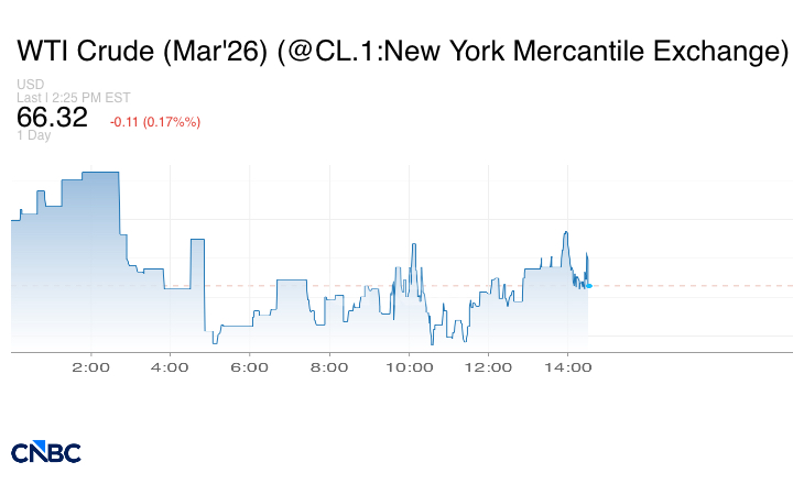 بينما انخفضت العقود الآجلة لخام غرب تكساس الوسيط الأميركي، تسليم مارس 4 سنتات أو 0.06% لتبلغ عند التسوية 66.39 دولار للبرميل.