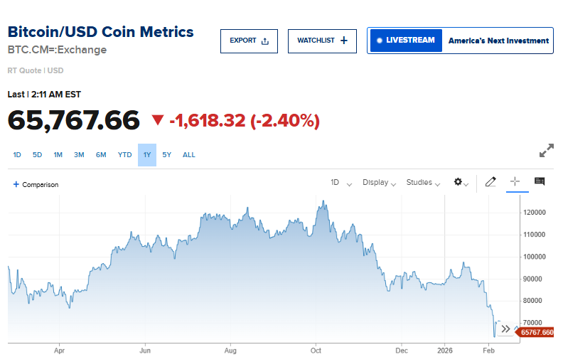 وشهدت بتكوين موجة بيع حادة منذ أكتوبر تشرين الأول الماضي عندما تجاوز سعرها 125 ألف دولار، مع استمرار الانخفاض حتى العام الجديد. وتراجعت أكبر عملة رقمية في العالم بنسبة 26% منذ بداية هذا العام، وخسرت أكثر من 47% مقارنة بالذروة التي سجلتها في أكتوبر تشرين الأول الماضي.