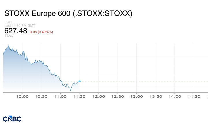 وانخفض مؤشر ستوكس 600 الأوروبي الأوسع نطاقاً 0.49% إلى 627.48 نقطة.