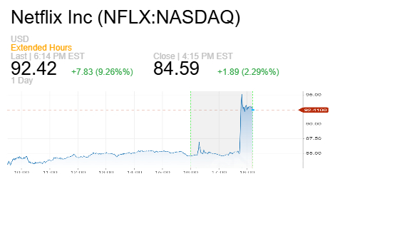 أسهم نتفليكس ارتفعت 10% في التداولات الممتدة، بينما تراجعت أسهم وورنر براذرز ديسكفري 2%.