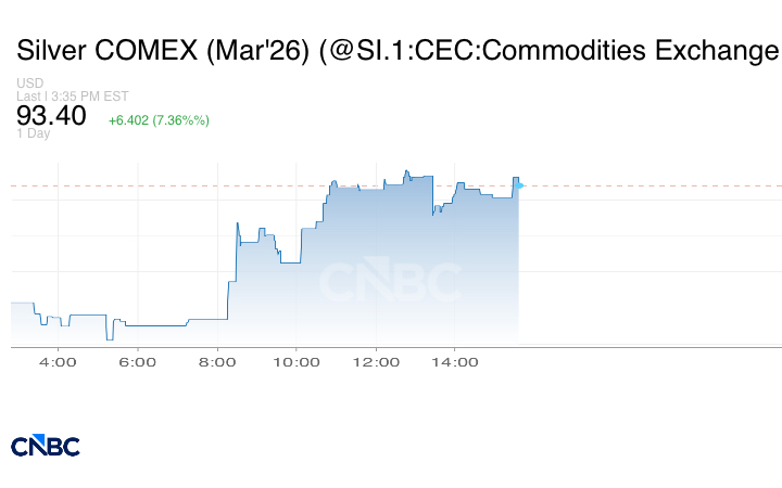 وبالنسبة للمعادن النفيسة الأخرى، ارتفع سعر الفضة الفوري بنسبة 6% ليصل إلى 93.67 دولاراً للأونصة، وهو في طريقه لتحقيق مكاسب شهرية بنسبة 10.3%.