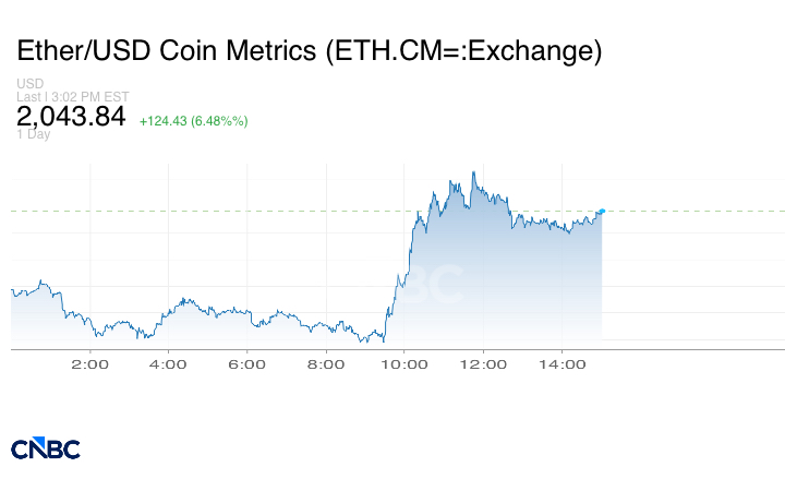 انتعاش العملات المشفرة شمل أيضاً الإيثريوم التي ارتفعت بنسبة 6.43% إلى 2,042.81 دولار.