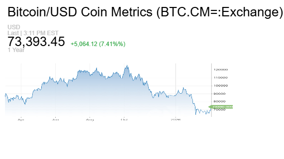 ارتفعت بتكوين خلال تعاملات آخر 24 ساعة بنسبة 8.20% لتصل إلى نحو 74 ألف دولار، فيما قفزت إيثيريوم بنسبة 10.47% لتسجل 2188 دولار، وصعدت سولانا بنسبة 9.20% لتقترب من مستوى 91 دولار.