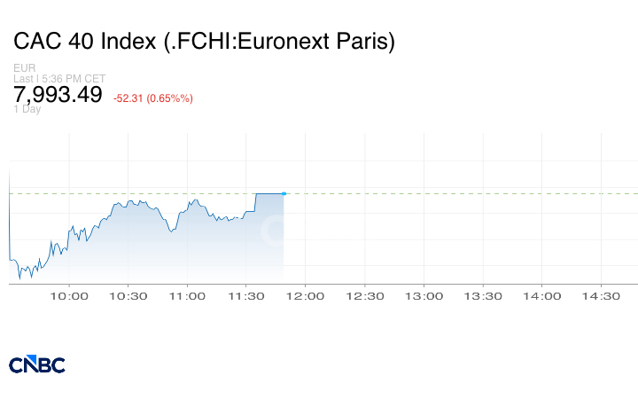 وانخفض مؤشر كاك 40 الفرنسي 0.65% مختتماً الجلسة عند 7,993.49 نقطة.