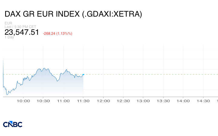 وتراجع مؤشر داكس الألماني 1.13% مختتماً الجلسة عند 23,547.51 نقطة.