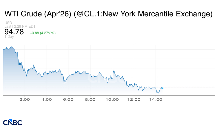 وكان سعر خام غرب تكساس الوسيط قد ارتفع إلى 119 دولاراً خلال الليل، مع خفض دول الخليج العربي إنتاجها بسبب استمرار إغلاق مضيق هرمز نتيجة التهديدات الإيرانية.
