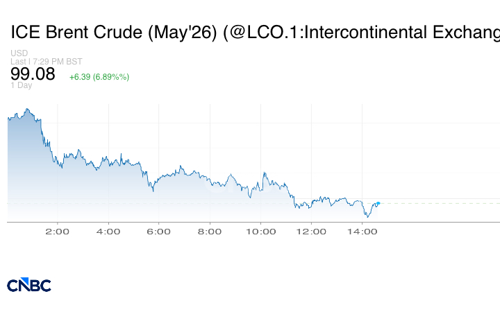 وارتفع سعر خام برنت، المعيار الدولي، عند التسوية 6.89% ليصل إلى 99.08 دولاراً للبرميل، بعد أن سجل أعلى مستوى له عند 119.50 دولاراً في وقت سابق من الجلسة. وهذه هي المرة الأولى التي تتجاوز فيها أسعار النفط حاجز 100 دولار للبرميل منذ الغزو الروسي لأوكرانيا عام 2022.