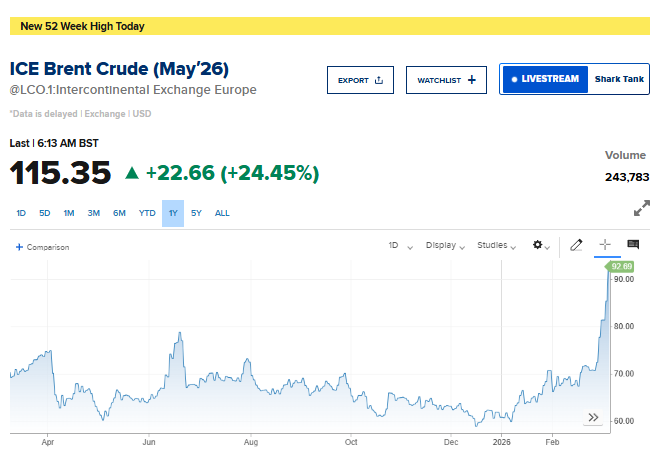 ارتفع خام برنت بنحو 24.4% ليصل إلى 115.35 دولار للبرميل، مع اتساع نطاق الحرب الأميركية الإسرائيلية مع إيران، ما دفع بعض كبار منتجي النفط في الشرق الأوسط إلى خفض الإمدادات، إلى جانب تصاعد المخاوف من اضطرابات مطولة في حركة الشحن عبر مضيق هرمز، أحد أهم الممرات البحرية الحيوية في العالم.